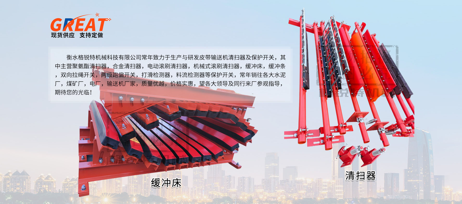 衡水格銳特機(jī)械科技有限公司常年致力于生產(chǎn)與研發(fā)皮帶輸送機(jī)清掃器及保護(hù)開關(guān),其中主營聚氨酯清掃器,合金清掃器,電動滾刷清掃器,機(jī)械式滾刷清掃器,緩沖床,緩沖條,雙向拉繩開關(guān),兩級跑偏開關(guān),打滑檢測器,料流檢測器等保護(hù)開關(guān),常年銷往各大水泥廠,煤礦廠,電廠,輸送機(jī)廠家,質(zhì)量優(yōu)越,價格實(shí)惠,望各大領(lǐng)導(dǎo)及同行來廠參觀指導(dǎo),期待您的光臨!!!